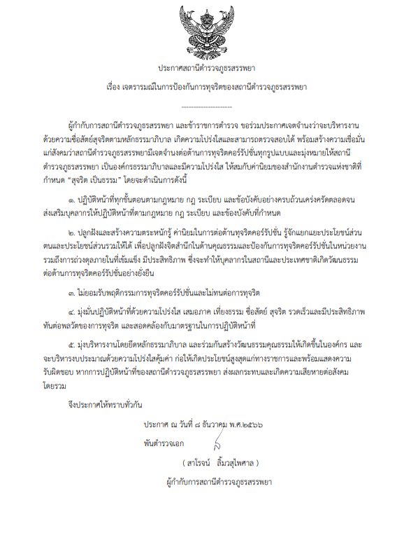 พ.ต.อ.สาโรจน์ ลิ้มวสุไพศาล ผกก.สภ.สรรพยา ผู้กำกับการสถานีตำรวจภูธรสรรพยา ประกาศเจตนารมณ์ของหน่วยงาน ประกาศเจตนารมณ์ ในการป้องกันการและต่อต้านการทุจริตชองสถานี และประกาศ เจตนารมณ์ไม่รับของขวัญ และสินบนอื่นใด ทุกชนิดจากการปฏิบัติหน้าที่ ในหน่วยงาน
