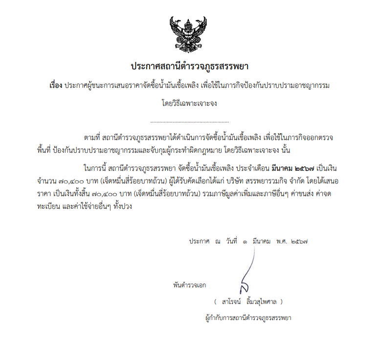 ประกาศผู้ชนะการเสนอราคาจัดซื้อน้ำมัน มี.ค.67